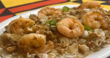Sauteed Crab and Shrimp with onions and Bell Peppers of a bed of rice